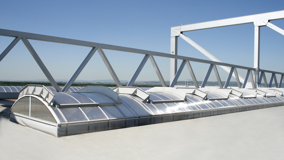 Bright, non-glare lighting of hangar interior and integration of combined SHEV and ventilation function for permanently reliable usage. Guarantee of personal safety and the stability of the continuous rooflights and SHEV flaps.