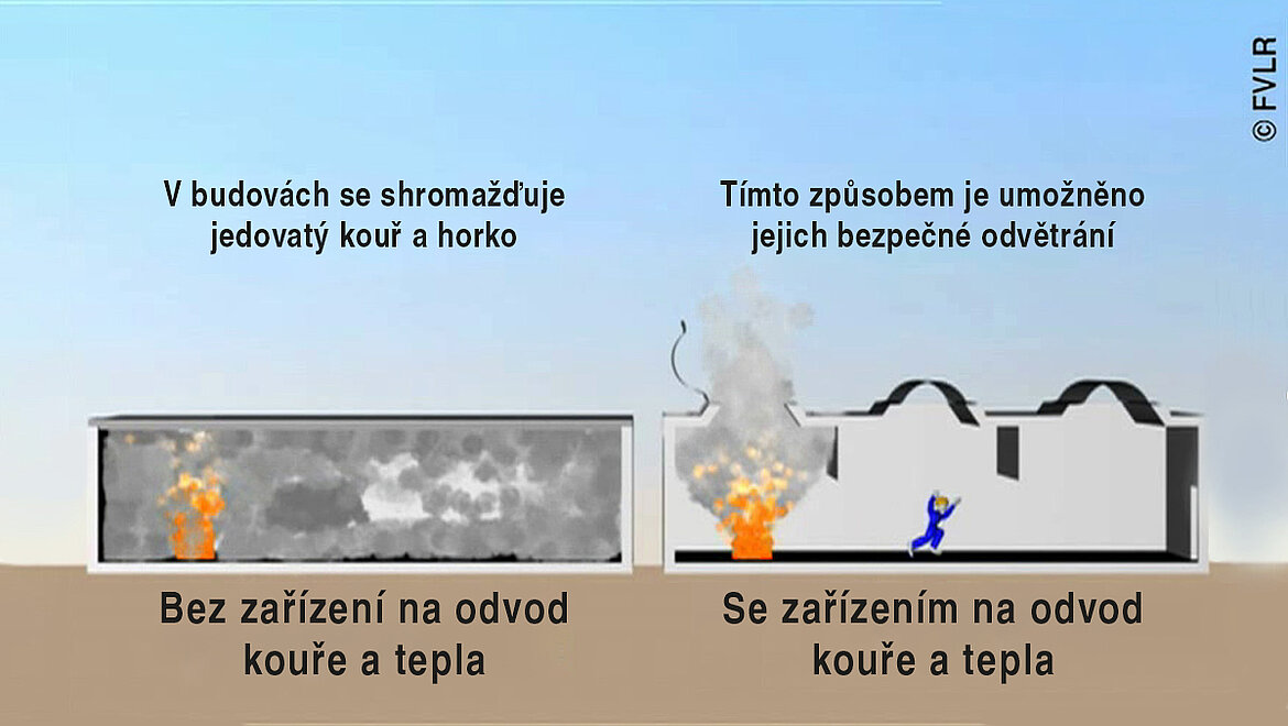 Ve velkoprostorových halách by mělo zařízení na odvod kouře a tepla v případě požáru zajistit ve spodní části haly vrstvu bez přítomnosti kouře. Tímto způsobem je nejen zajištěna úniková cesta bez kouře, ale je umožněn i rychlý zásah požárníků. To usnadňuje hašení a také záchranu zraněných osob, které již vlastními silami nemohou uniknout. Často je tak možné zabránit rozšíření požáru na velký požár.