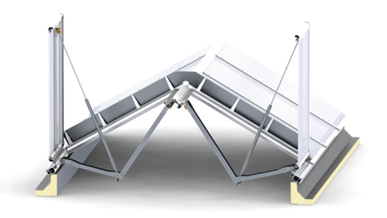CI-Systém zařízení na odvod kouře S - bezpečné řešení klapek pro architektonická propracovaná řešení v oblasti sedlových střech.