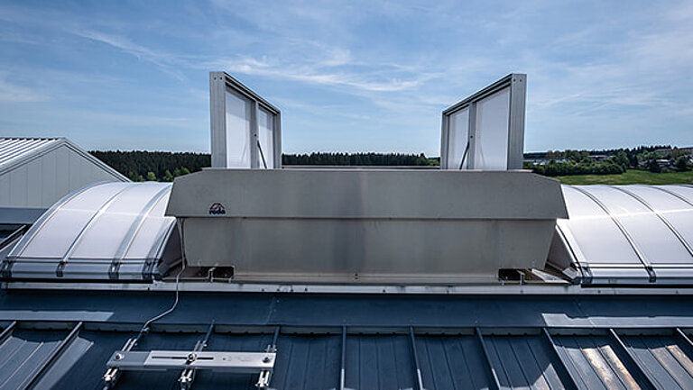 Nezáleží na tom, zda se jedná o použití jako samostatné nebo dvojité klapky - Cl-Systém zařízení na odvod kouře B zajišťuje přívod čerstvého vzduchu a odtahu kouře u vypouklého světelného pásu.
