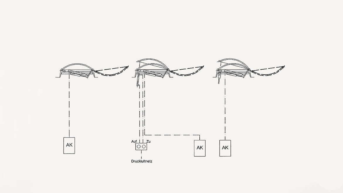 - Funkce RWA na výběr pouze Otevírání nebo Otevírání/zavírání: Volitelná funkce zavírání slouží jednoduchému, pneumatickému uzavření po funkční zkoušce nebo po neplánovaném spuštění alarmu. Výhoda: Kopule se nemusejí zavírat náročným způsobem ze střechy. Funkce RWA zařízení na odvod kouře CI-systému můžete v krátkých intervalech pohodlně testovat i pomocí skříňky s alarmem.